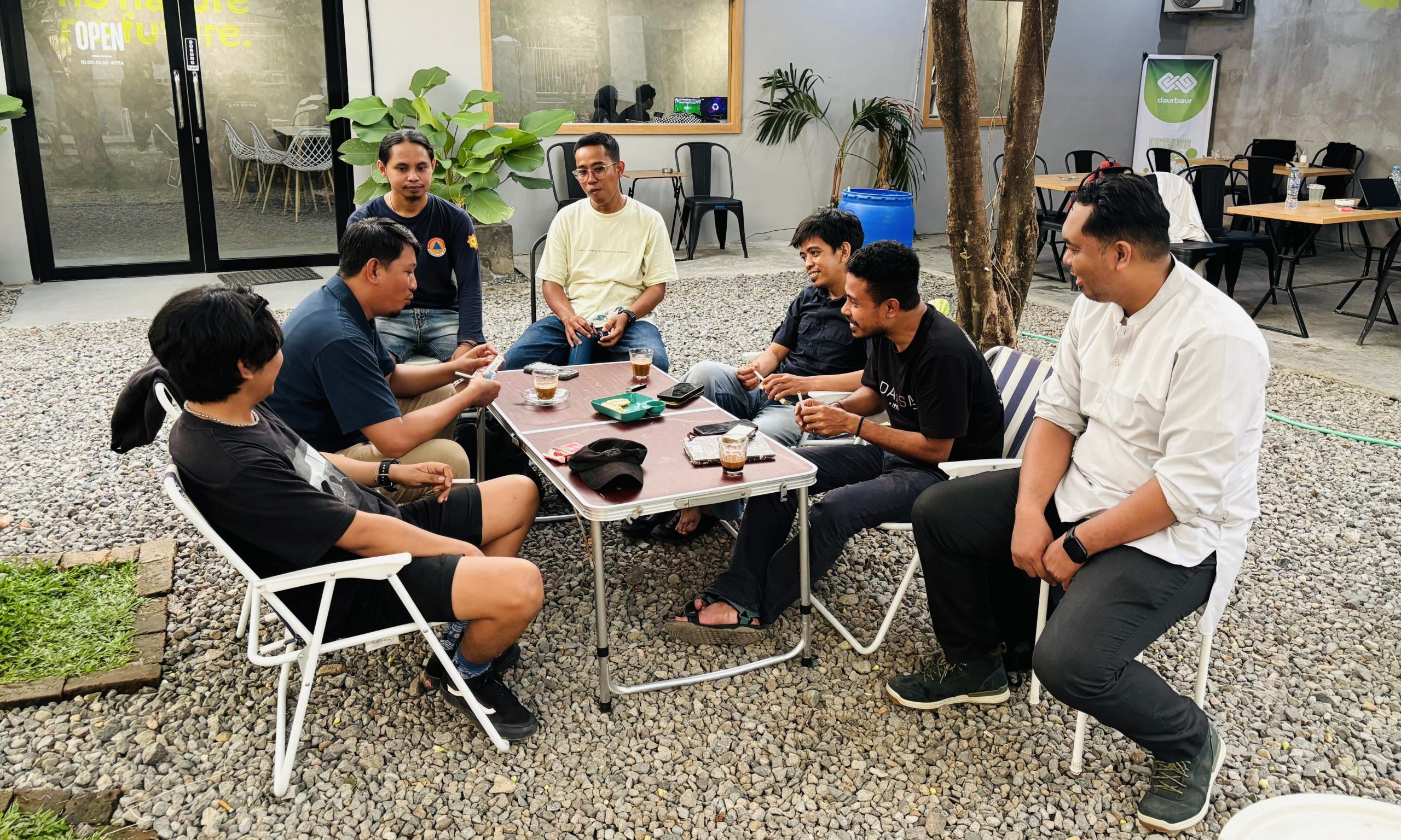 Di jedah hujan bulan Desember, perbincangan menarik terjadi di salah satu kedai kopi di sekitar Universitas Hasanuddin. Lingkaran kecil terbentuk di bawah pohon jambu air dan mangga. Uap kopi bercampur udara basah, hangat oleh pikiran, ide, dan candaan. Tidak ada jarak di antara mereka. Yang ada hanya rasa kekeluargaan yang tumbuh pelan-pelan, alami.