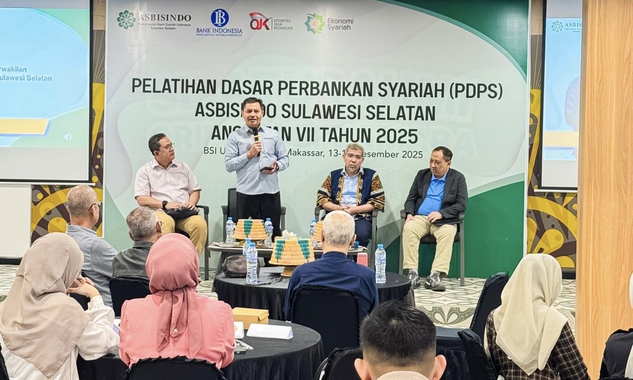 MAKASSAR, inspirasinusantara.id — Asosiasi Bank Syariah Indonesia (ASBISINDO) Sulawesi Selatan berkolaborasi dengan Kantor Perwakilan Bank Indonesia (BI) Sulawesi Selatan dan Otoritas Jasa Keuangan (OJK) dalam memperkuat kualitas sumber daya manusia perbankan syariah melalui Pelatihan Dasar Perbankan Syariah (PDPS) Tahun 2025. Kegiatan ini digelar pada 13–14 Desember 2025 di BSI UMKM Center Makassar.